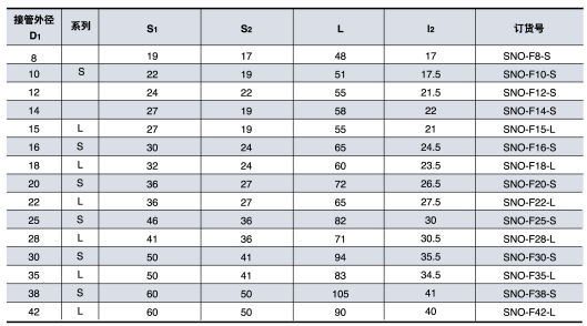 EMB直角接頭主要型號有F8-S;F10-S;F12-S;F14-S;F15-L;F18-L;F22-L等。
