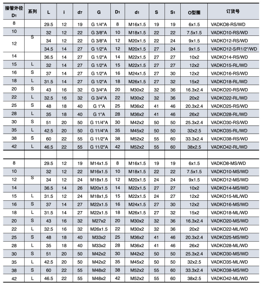 EMB可調(diào)式端直通接頭主要型號(hào)有VADKO8-RS/WD;VADKO12-RS/WD;VADKO22-RL/WD等