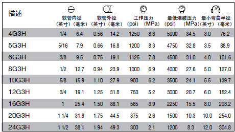 溫度范圍:恒壓液壓油管為-40°F到+275°F (-40°C到+135°C),間歇為+300°F(+149°C) (可達運行時間的10%)。
