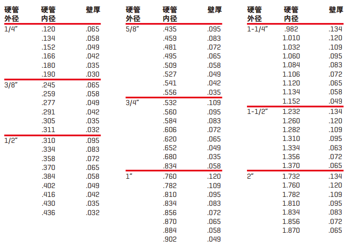 2) 如果硬管的內(nèi)徑不存在,則選擇相鄰的較大的內(nèi)徑。在這個案例中,最終選擇的硬管應該是1“外徑, .065”(1.65mm)壁厚的硬管。