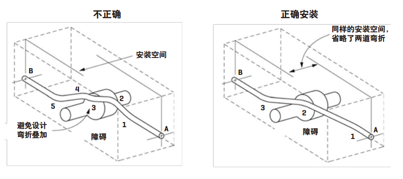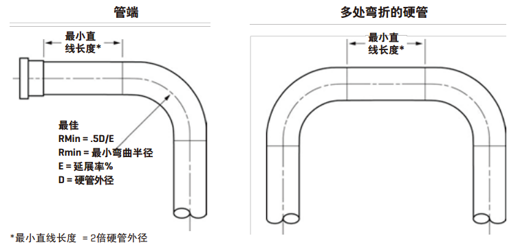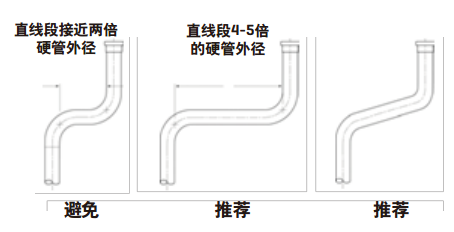 如果兩個(gè)90度彎折之間的直線橘綠接近最小的推薦值(見(jiàn)圖3),由于折彎?rùn)C(jī)器上的干涉問(wèn)題可能會(huì)對(duì)彎管造成麻煩。在兩個(gè)彎折處之間設(shè)計(jì)額外的直線距離或者降低彎折角度可以避免這個(gè)問(wèn)題(見(jiàn)圖3)。
