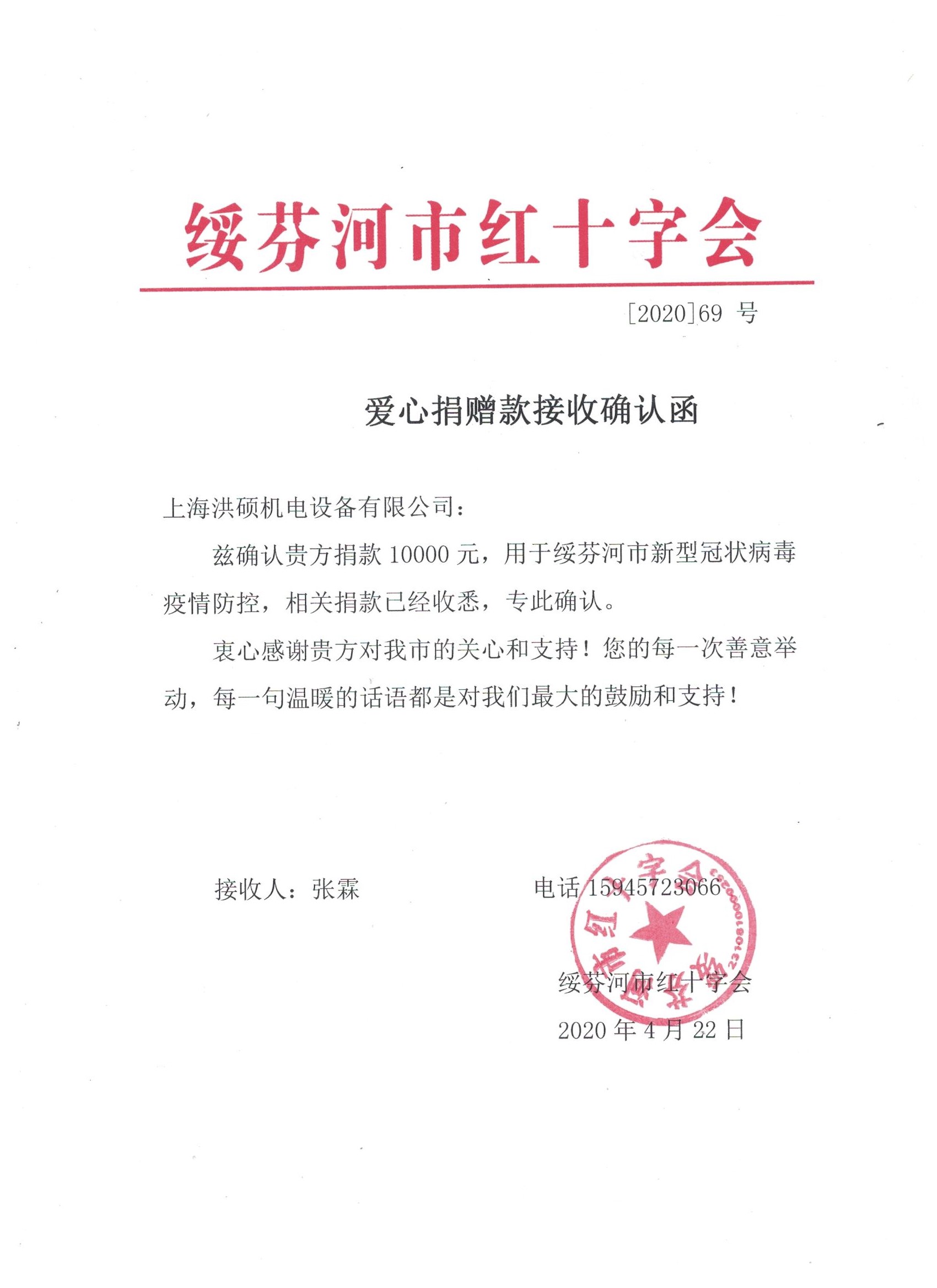 為抗擊新冠肺炎疫情,4月22日,上海洪碩機(jī)電設(shè)備有限公司向綏芬河市紅十字會(huì)捐贈(zèng)10000元,用于綏芬河市新型冠狀病毒疫情防控工作。愛(ài)心匯聚, 共抗疫情,上海洪碩機(jī)電設(shè)備有限公司以真誠(chéng)愛(ài)心、實(shí)際行動(dòng)履行企業(yè)責(zé)任,踐行使命擔(dān)當(dāng)!