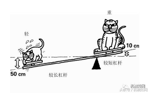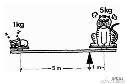 1 公斤的貓坐在距杠桿支點 5 米的位置,它與坐在距杠桿支點一米位置的 5 公的貓可以使杠桿平衡,就像液壓杠桿中的平衡重量一樣。