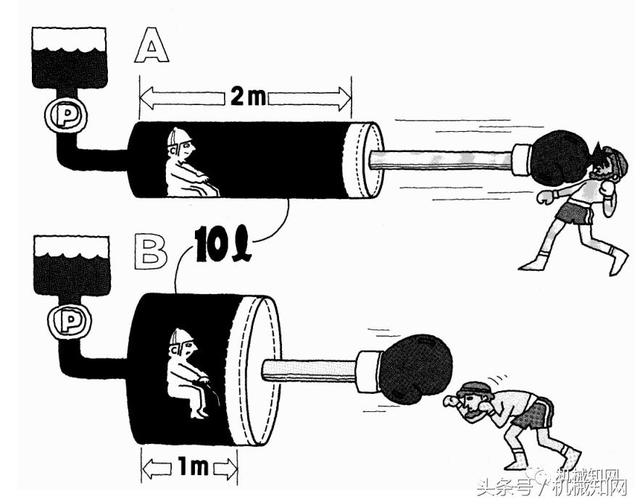 這里油缸 A 為兩米長,容量 10 升,油缸 B 只有 1米長,但是容量也是 10 升。如果我們每分鐘將 10升液體泵入每一個油缸,兩活塞將在一分鐘內(nèi)完成它們的全部行程;在這種情況下,油缸 A 中的活塞運動速度快是油缸 B 的兩倍。這是因為在相同時間內(nèi)它有兩倍于 B 油缸的距離移動。