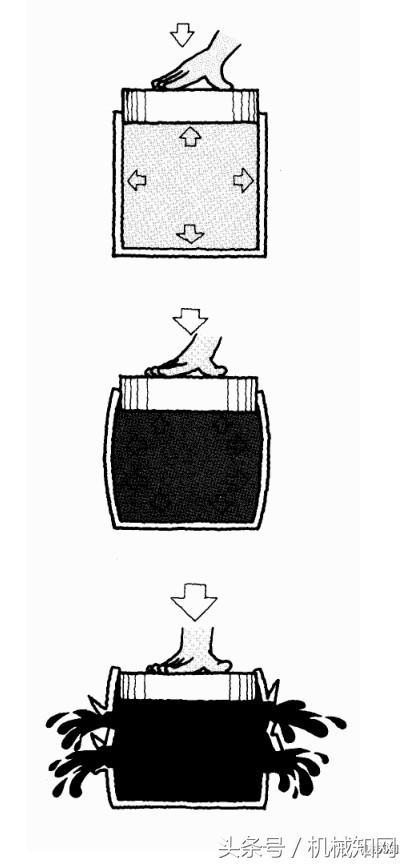 如果你按動一裝滿液體容器的塞頭,液體將止動塞頭。按動塞頭受到液體的抵抗力與容器各邊受到的力相同。如果繼續(xù)越發(fā)用力地按動塞頭,則容器會遭到破壞。