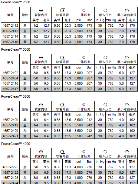 推薦用途:重載清洗設備中的高壓冷熱水。撓性好。應采用彎曲限位器延長使用壽命。