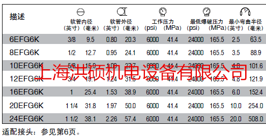 一、推薦用途:極端高壓、高脈沖的應(yīng)用,比如靜液壓傳動(dòng)裝置。EFG6K在設(shè)計(jì)上達(dá)到SAE 100R15規(guī)范的所有要求、EN 856 4SP (-6、-8、-10和-12)和 EN 856 4SH (-12、-16和-20)的性能要求。適用于可生物降解液壓油,比如多元醇酯、聚乙二醇、植物油以及標(biāo)準(zhǔn)石油基液壓油??商峁?span lang="EN-US">121’到200’的各種連續(xù)長度。內(nèi)膠層:黑色、耐油的合成橡膠(C類-丁腈橡膠)。具體參見“軟管材料性能參數(shù)表”。