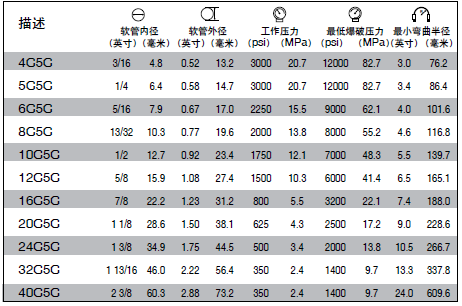 溫度范圍:SAE 100R5 (液壓)工況為-40°F到+212°F (-40°C到+100°C);通用車(chē)隊(duì)?wèi)?yīng)用(熱潤(rùn)滑油管)為-40°F到+300°F (-40°C到+149°C);空氣只能為+160°F (+71°C)。要避免同時(shí)以最高溫度和最高工作壓力下連續(xù)使用。